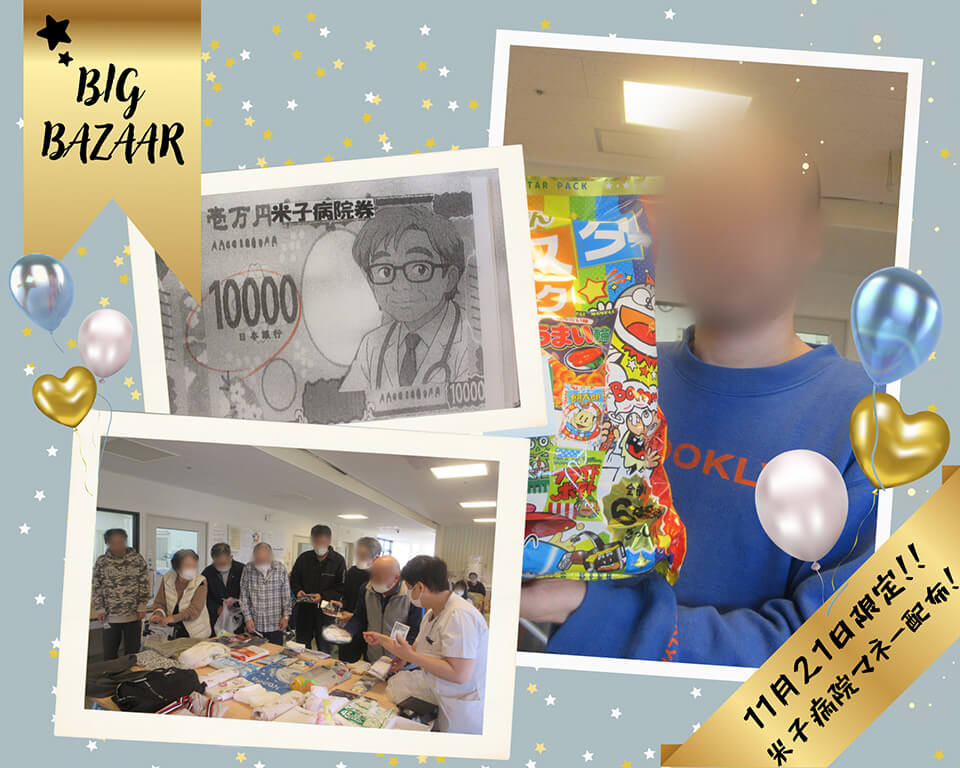 米子病院マネーを作成し、買い物をする時のお金の管理についても体験してもらいました。ビッグバザールの締めくくりとして、景品の当たる抽選会も行いました。患者さんからは「楽しかった!」「ワクワクした♪」「たくさん買い物した!!」などの感想をいただき、楽しい時間を過ごすことができました。